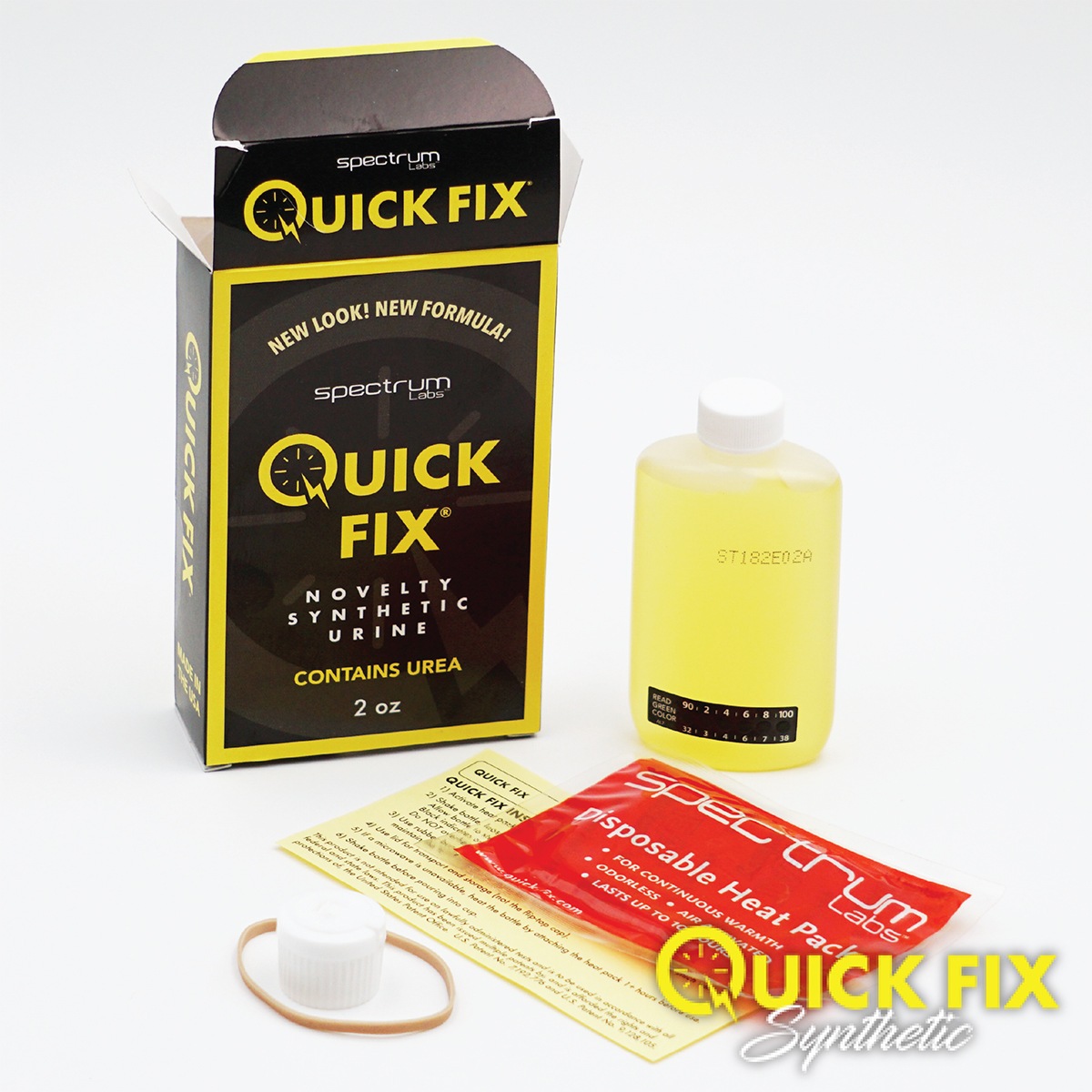 Quick Fix formula 6.2 urine kit contains a 2-ounce sample of already premixed artificial urine that is ready for immediate use. The latest Quick Fix formula now comes with uric acid to make it completely unmistakable from real human pee.